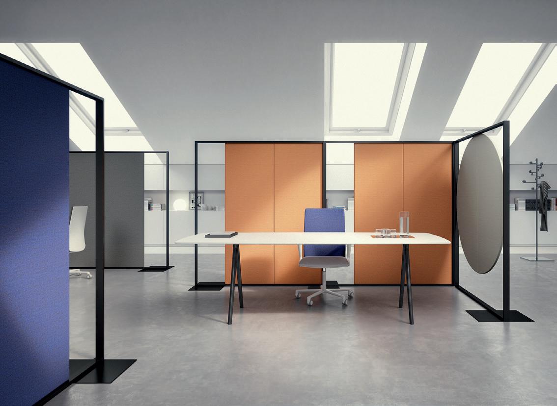 STRUTTURE LIBERE E DALLA FORTE PERSONALITÀ che permettono di ricavare spazi per la concentrazione individuale o la collaborazione in team. Progettati dai designer Lievore Altherr Molina, i pannelli Parentesit di Arper si ispirano all’arte minimalista e alle geometrie degli interni giapponesi. Caratterizzati da un design modulare, consentono l’accostamento di varie forme. I moduli sono infatti disponibili in quattro versioni: due pannelli tondi di diverse dimensioni, un pannello quadrato e una combinazione composta da pannello quadrato e rotondo.
