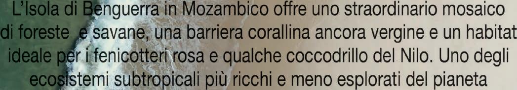 L’Isola di Benguerra in Mozambico offre uno straordinario mosaico di foreste e savane, una barriera corallina ancora vergine e un habitat ideale per i fenicotteri rosa e qualche coccodrillo del Nilo. Uno degli ecosistemi subtropicali più ricchi e meno esplorati del pianeta