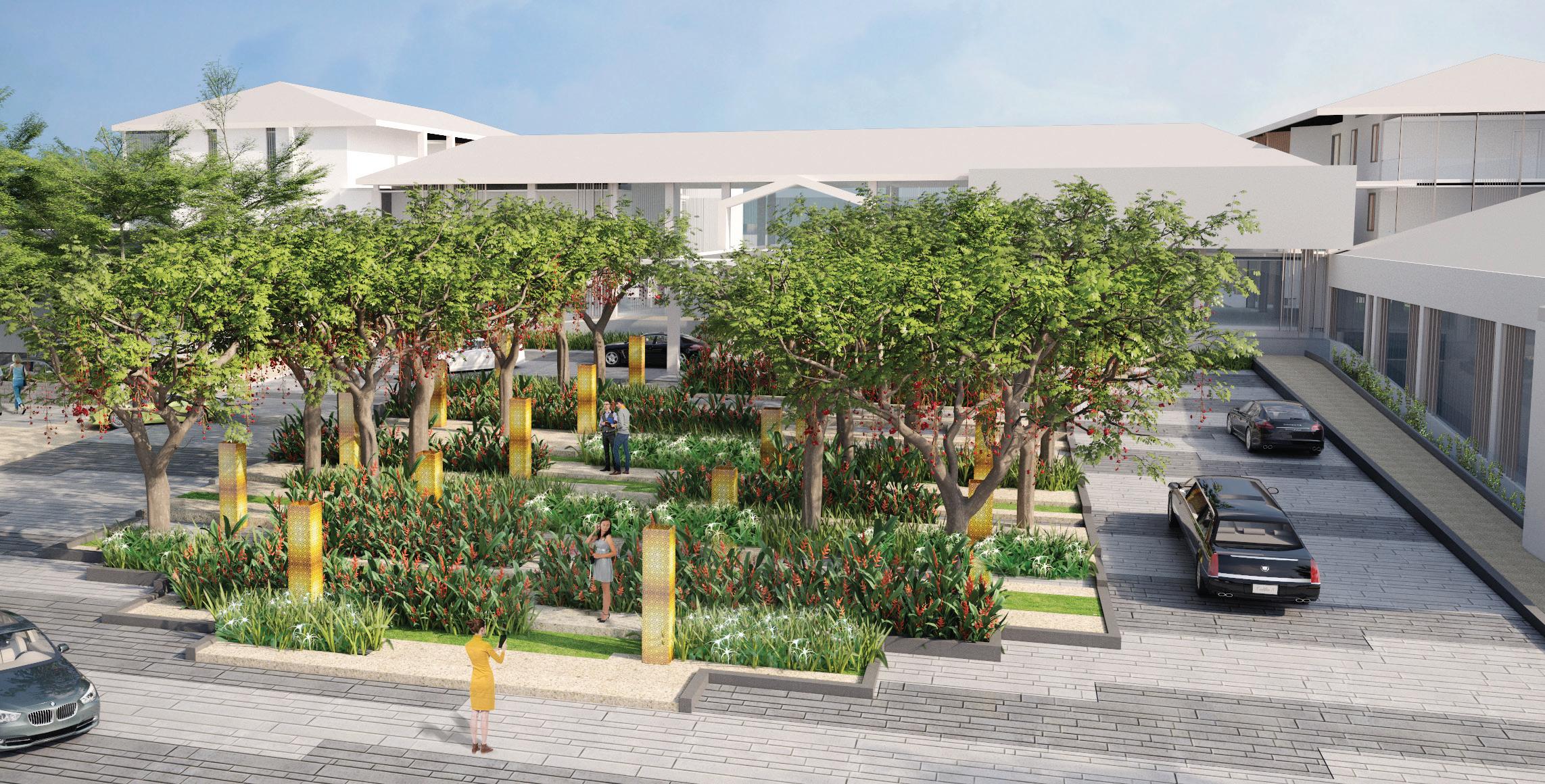 This community includes a bustling clubhouse and marina with private slips for villas. Lift-lock boat access provides security for residents and includes integrated landscape/water filtration. Walkways connect pedestrians with nature and areas around the marina with residential canals, offering respite from nearby urban centres. Garden terraces are designed for dining, lawn weddings, and family fun. The rooftop VIP arrival terrace features an infinity pool framed by native grasses, flowering ornamentals, elegant palms, and a green wall.