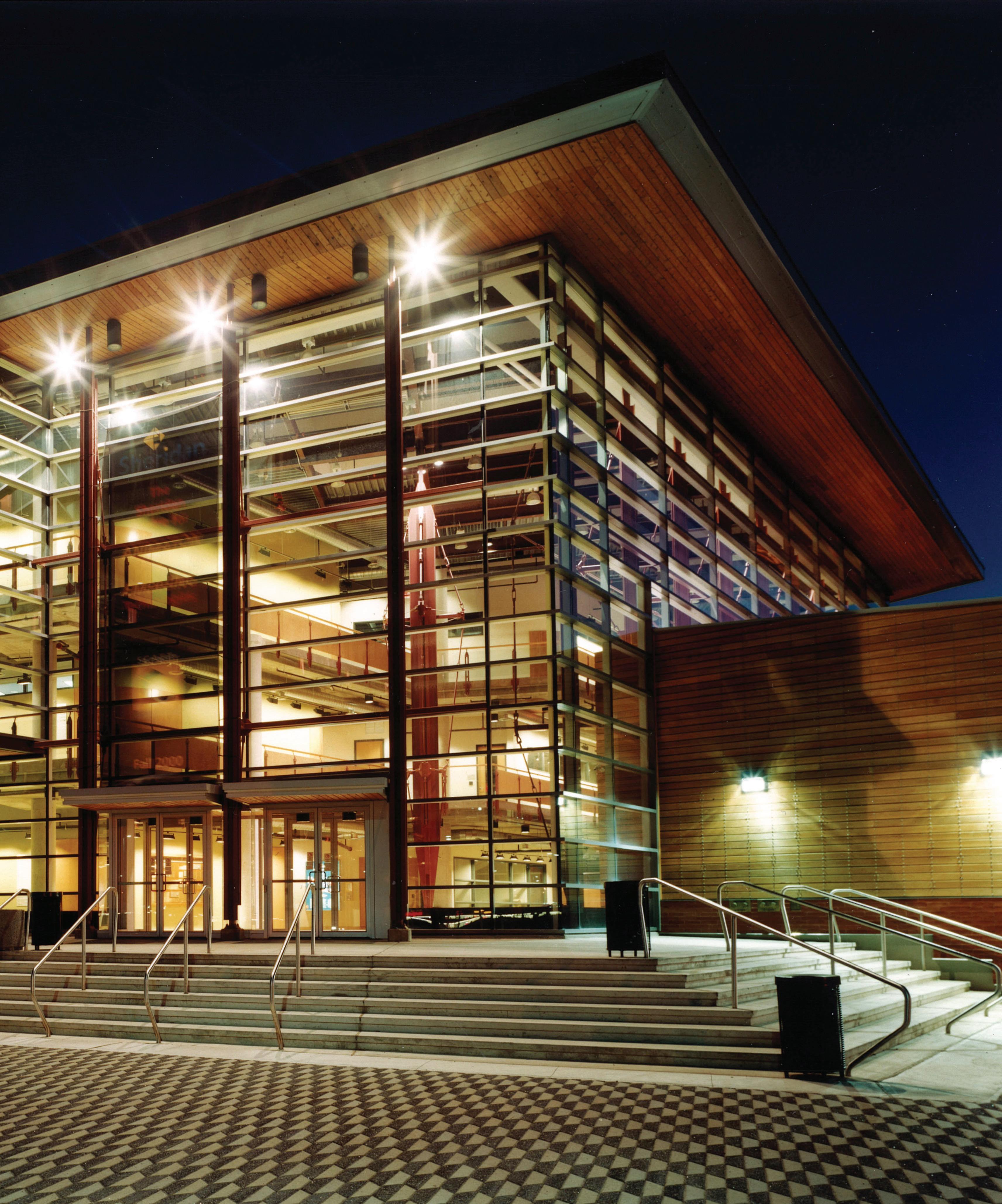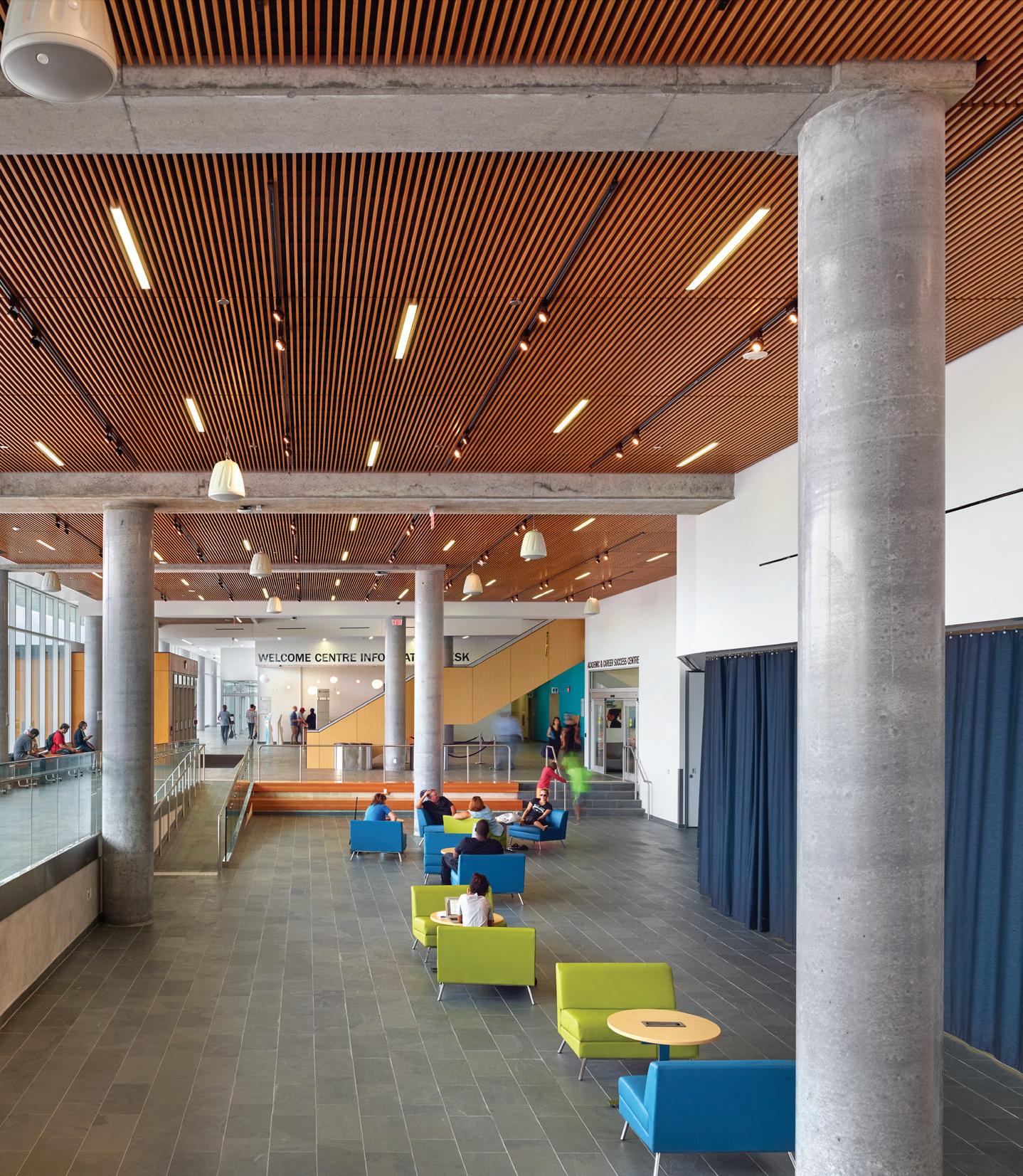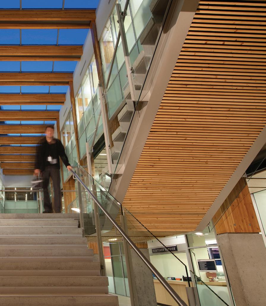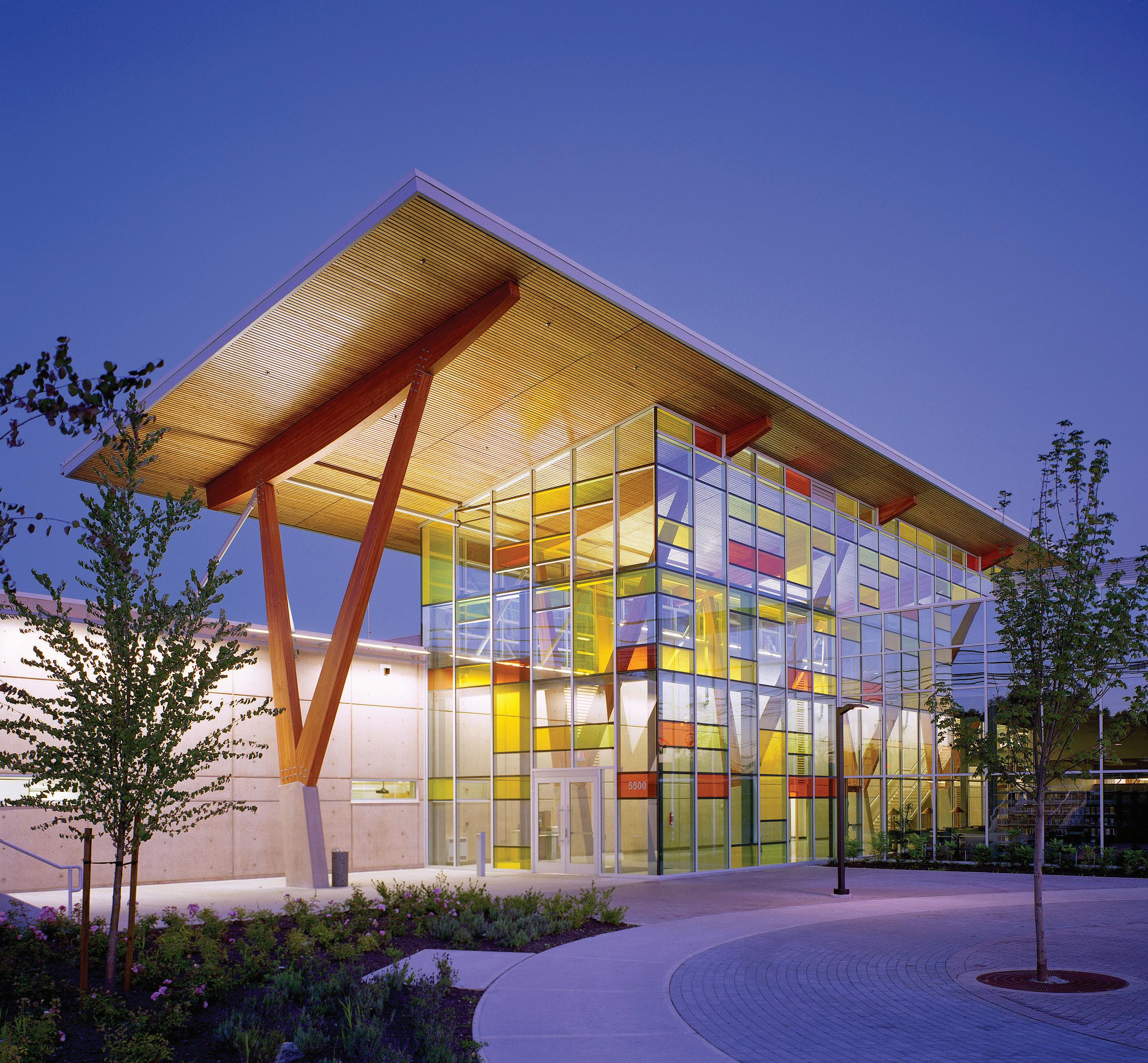 This signature building creates a new gateway to Kwantlen Polytechnic University’s high-tech facility for trades, technology and applied training programs. The facility provides direct connectivity and views to the outdoors, which is predominated by an indoor ‘covered street’ which provides visual and physical access to every floor and ensures optimum natural light and ventilation. The atrium features an expressive double height glu-laminated structure and a series of skylights which allow natural daylight to illuminate the space which is augmented with multi-coloured glazing. The celebration of craftsmanship is put on display throughout the facility to further enhance the learning experience for students. The centre’s anticipated 30% (approximate) savings in energy usage is sufficient to power 19 typical Vancouver homes annually.