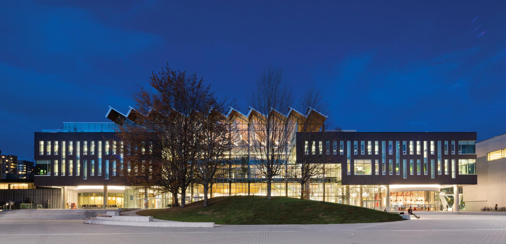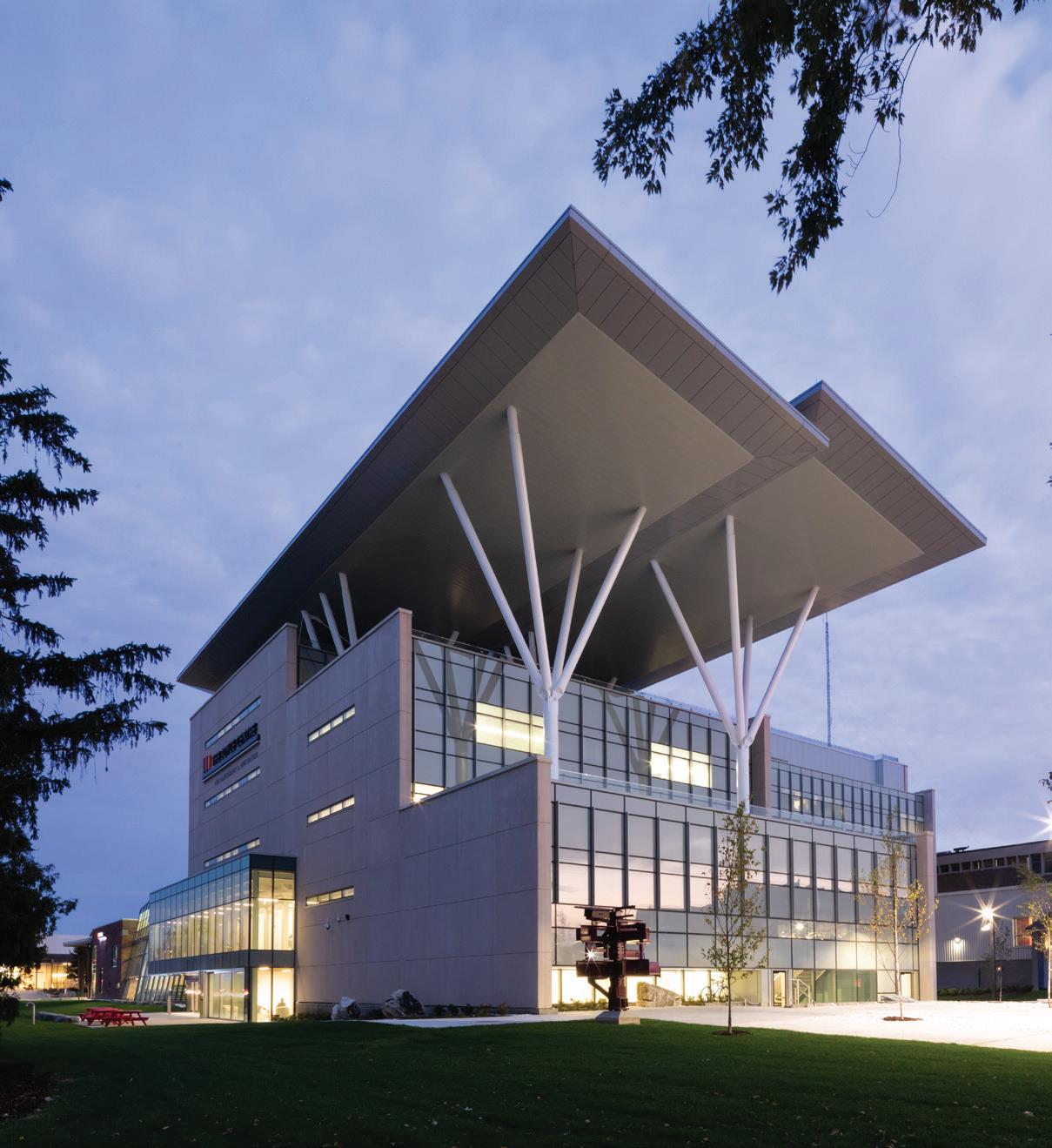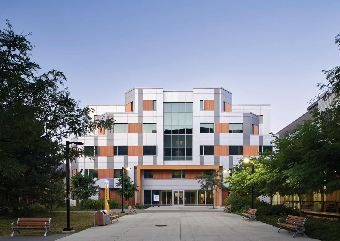 The Engineering, Management and Education Building contains both the Faculty of Applied Sciences (Engineering) and the Faculty of Management. The two buildings are connected by a central atrium and organized around shared amenities, including common areas, classrooms, lecture theatres and a collegium. Within each faculty area there are customized faculty and administration offices, a variety of teaching and research labs as well as library facilities. The modularized building form is designed to easily adapt to future expansion.