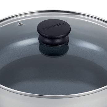 • Easy to clean as the non-stick layer avoids sticky food residues. Glass lid with stainless steel rim and air vent hole to prevent boiling over and allowing steam to escape.
