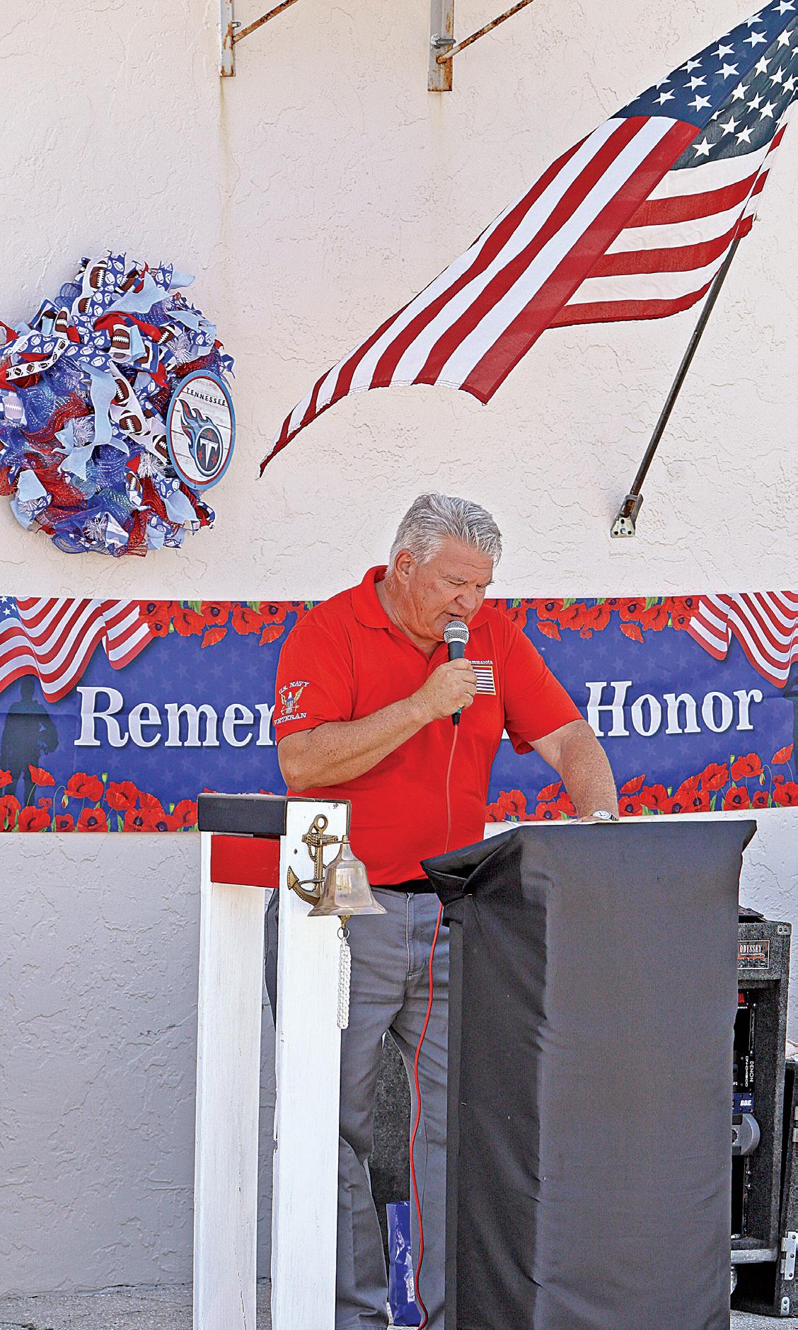 Bottom: A bagpiper; a contingent from the Knights of Columbus Assemby 215; and Mick Sheldrake, a U.S. Navy vet who served multiple deployments, rings the Bell of Honor in memory and respect for the fallen.