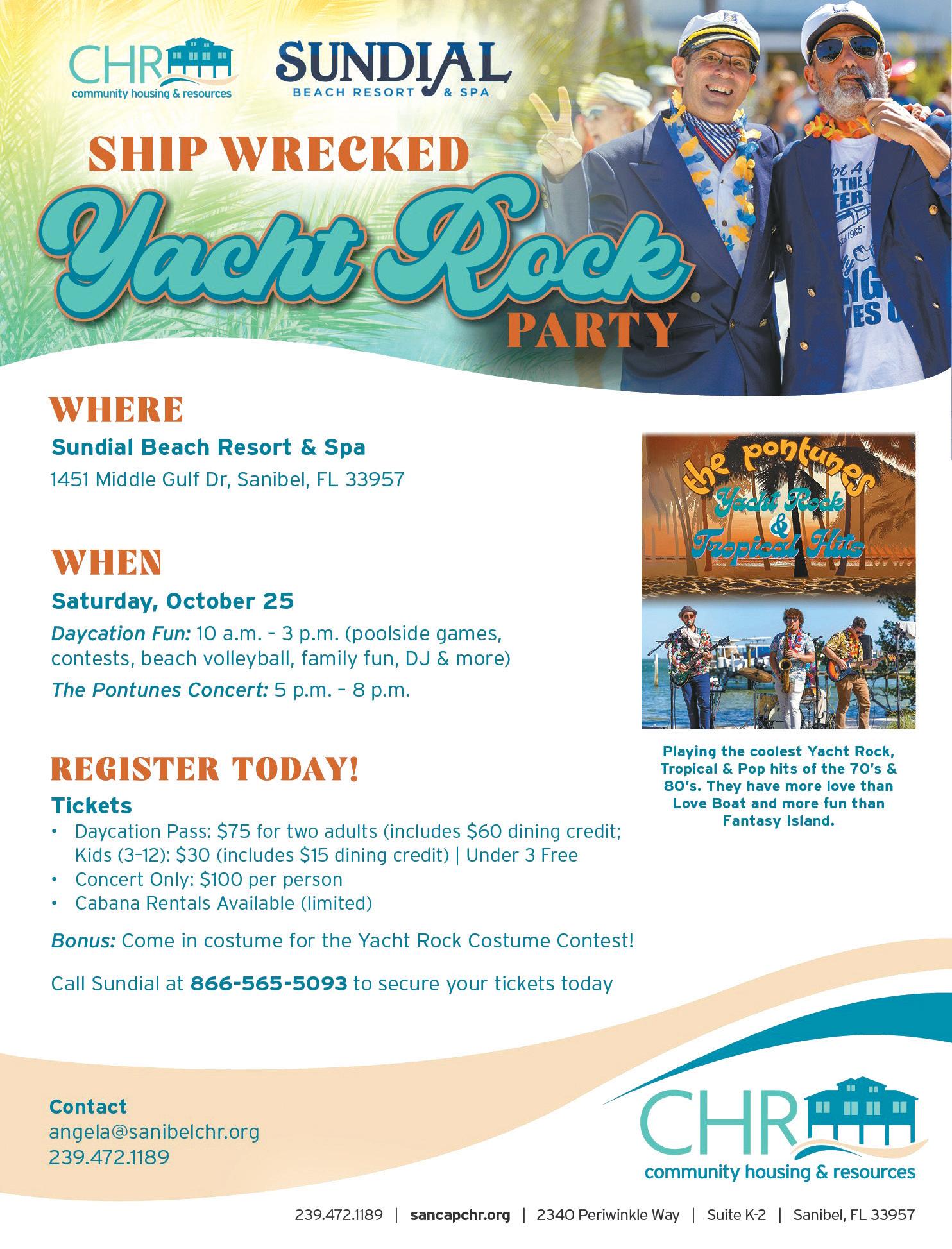 concert will take place on Dec. 6 at the ‘Tween Waters Island Resort & Spa on Captiva. Race registration is $50 for the 10K or 5K and $40 for ages 16 and under, which will increase after Oct. 31; virtual participation is also available. Concert tickets are $75 or $50 for ages 7-18, with a four-pack for $200 while supplies last. For more information, including sponsorship opportunities, visit https://fishofsancap.org/.
