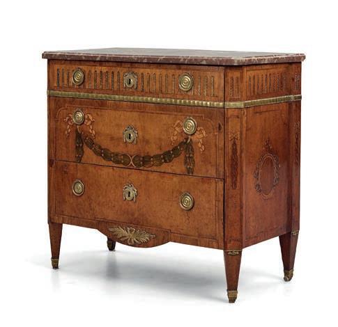 Fanerad med björk, lönn, jakaranda och fĂ€rgat lövtrĂ€. Beslag av förgylld mĂ€ssing. Skiva av grĂ„ kalksten. Upptill lĂ„da. Bakom klaff fack och sju lĂ„dor. Nedtill lĂ„da. Dekorerad med inlĂ€ggningar av pilkoger, pilbĂ„ge och fackla i lagerkrans. Sidor med motiv av musiktrofĂ©. LĂ€ngd 101, bredd 47, höjd 121 cm. Nyckel medföljer. Utropspris: SEK 100 000 â 125 000 / EUR 9 360 â 11 700