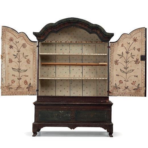 1. SkĂ„p, VĂ€rmland troligen Fryksdalen, 1700âtalets senare del. Rik bemĂ„lning. Rokokoformat krön. Dörrspeglar med motiv av blomster i urnor. TvĂ„delat, överdelens tvĂ„ dörrar med bakomliggande fyra hyllor, underdelen med lĂ„da. LĂ€ngd 155, bredd 65, höjd ca 230 cm.