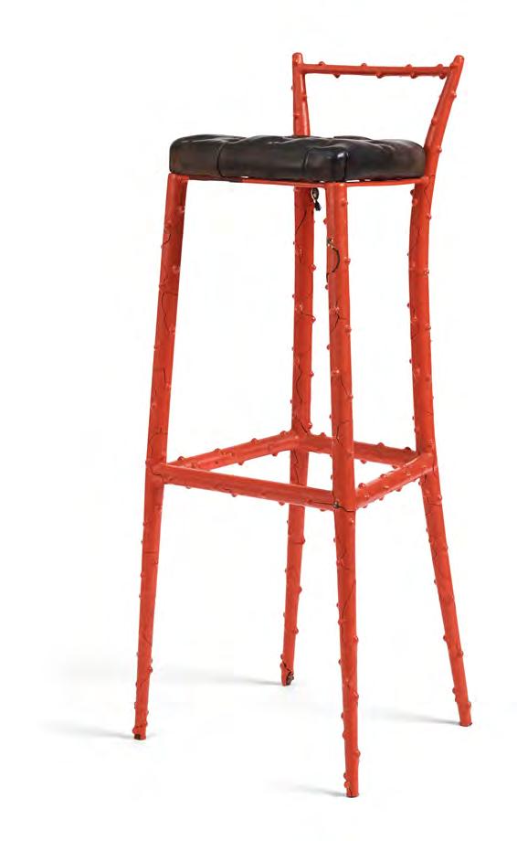 Metal base lacquered in red/orange, seat in black leather, maker’s mark Fornasetti, seat height 97 cm, height 108 cm.