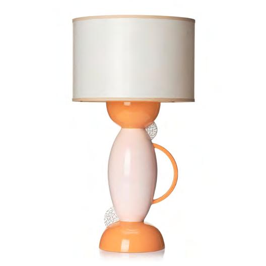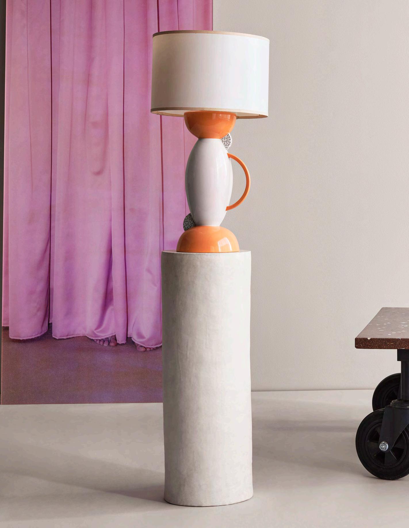 Pink, orange and black/white glazed ceramic base, textile shade, signed ‘Matteo Thun Memphis 9/200 Drimmer’, height 56 cm.