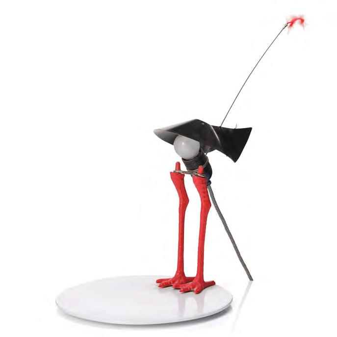 White ceramic base, red plastic legs, body in black lacquered metal, metal arm, signed ‘bibibibi Ingo Maurer 137/500’, height c. 50 cm.
