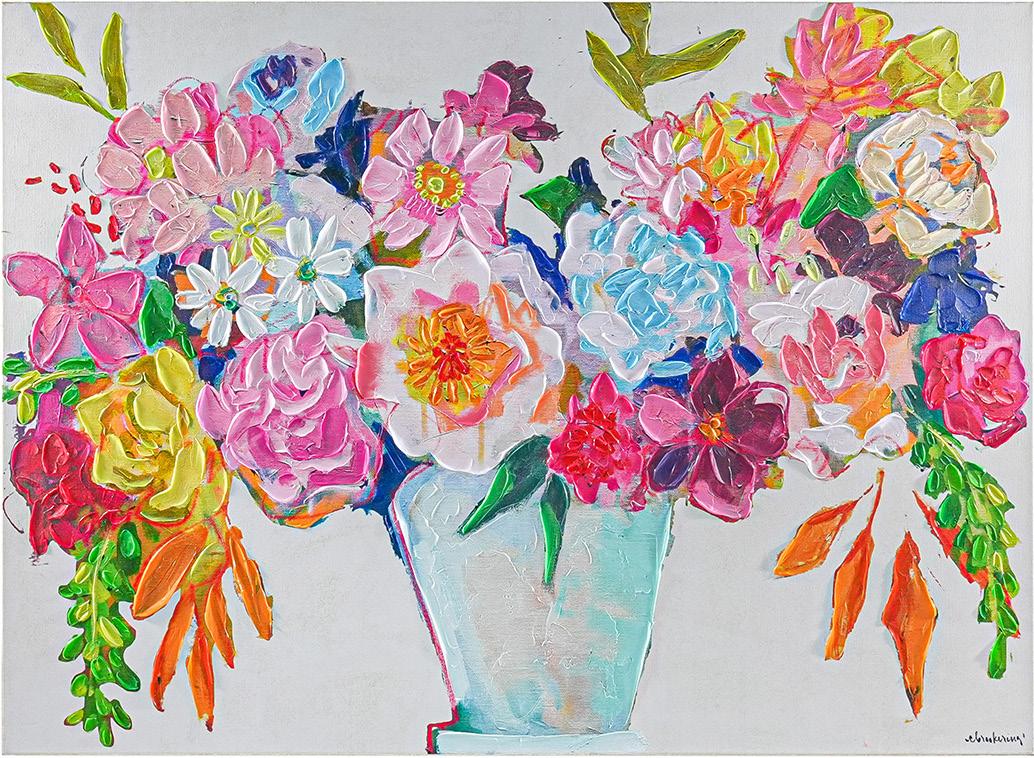 Immerse yourself in the vibrant world of C. Brooke Ring, a celebrated American artist from Greenville, SC. Her mastery shines through in this exquisite floral arrangement, bursting with radiant colours and intricate textures. Rooted in femininity and influenced by her graphic design background, Brooke’s work reflects her faith and desire to spread joy. Known for her colourful florals, coastal scenes, and figurative pieces, this artwork brings life, beauty, and inspiration into any space.