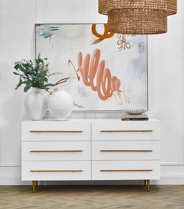 Persimmon tones jump off the canvas while the white Santiago buffet and brass Nagano table lamps add contrast and keep things fresh.