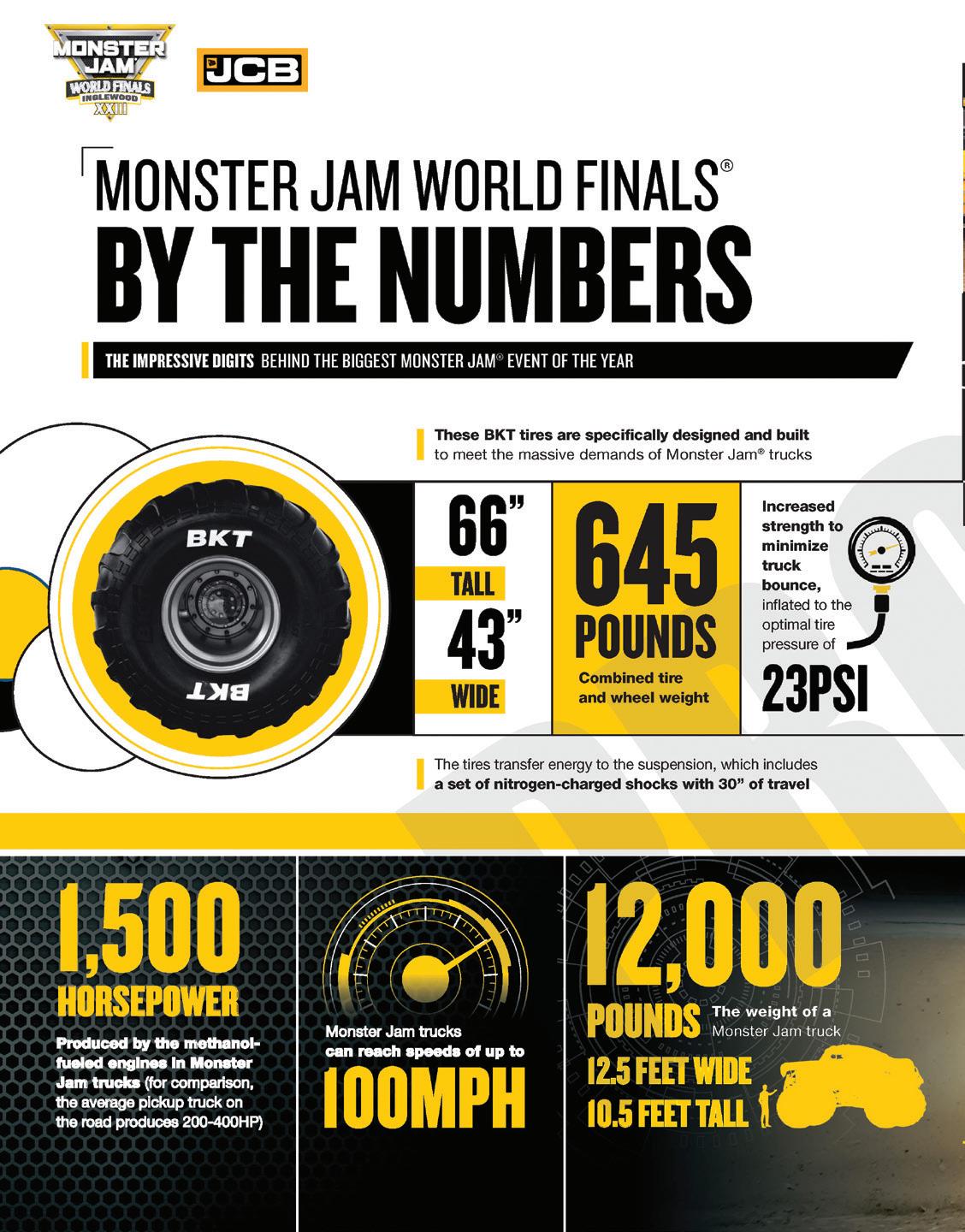 trucks on two wheels showcasing control and technique, and donuts, where the trucks spin in tight circles creating a donut pattern. Monster Jam® announced their multi-year partnership with JCB, a global leader in construction and agricultural equipment manufacturing, as a collaboration that marks JCB as the Official Heavy Equipment Partner for Monster Jam®. This partnership allows JCB to engage with dealerships and customers across more than 100 markets worldwide annually.