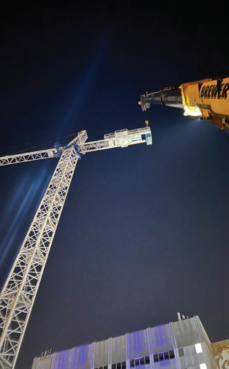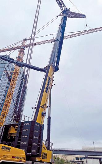 dismantle tower cranes and hoists, another line of business at Brewer Crane. “Developers and large general contractors use tower cranes to build high-rise structures in urban areas. We provide tower cranes, erection and dismantling services, tower crane operation services, along with routine maintenance and inspection,” says Hukee. “I made a move to the Grove GMK6400 around four years ago. It is a massive crane that is transported with the boom over the rear in a dolly. It has a total vehicle length of around 80 feet. We drive these units to and from jobsites, but they are followed by as many as 14 to 15 semi trucks to dress it out fully.”