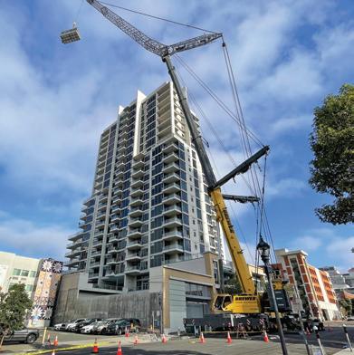Above: The Grove GMK6400 has 197' of main boom, 259' of luffing jib, a mega-wing attachment, and 297,000 lbs of counterweight. This crane is capable of a wide variety of lifts and applications - shown here flying a cooling tower to the roof of a residential building in downtown San Diego.