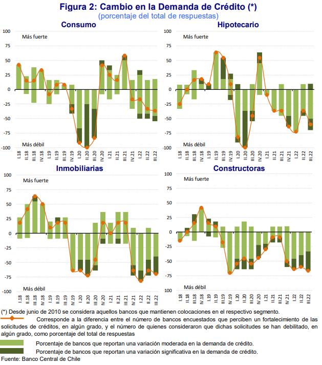 Para segmento hipotecario: oferta de crédito restrictiva y demanda más débil por cuarto trimestre consecutivo. Para crédito comercial (inmobiliarias y constructoras) se agravan las restricciones y se debilita la demanda.