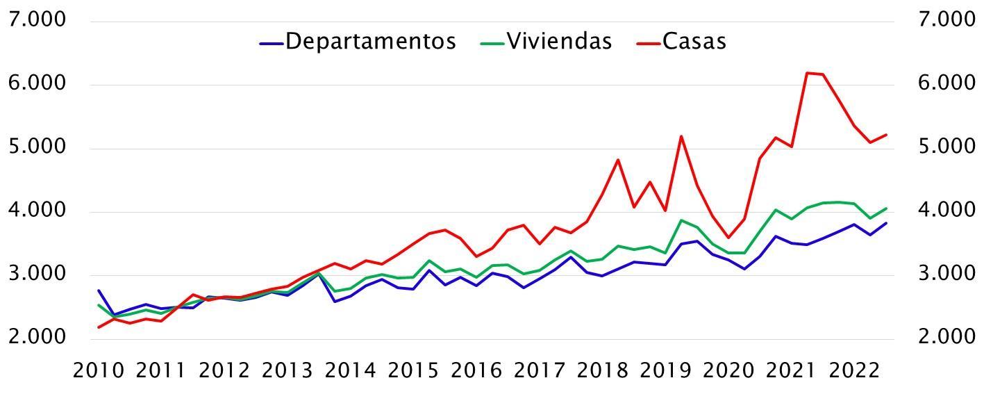 El precio de los departamentos ha seguido una clara tendencia alcista desde 2017, pero en especial desde la segunda mitad de 2020.
