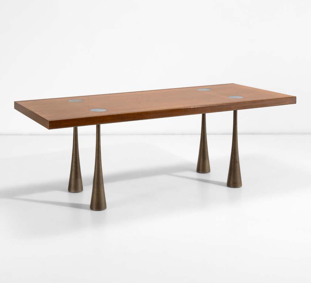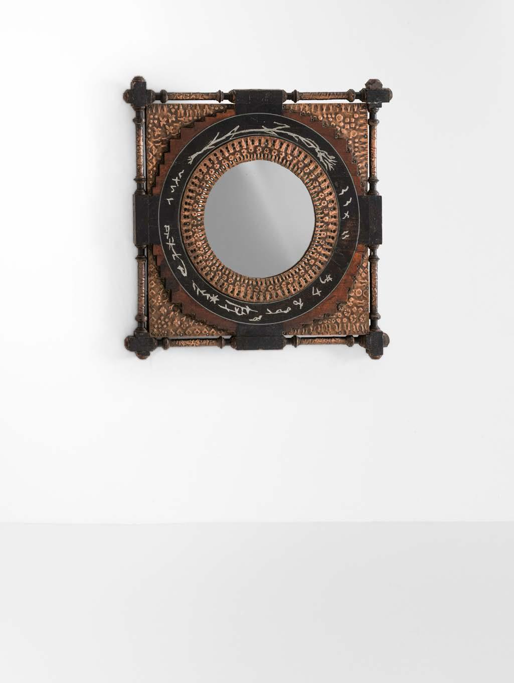 Struttura in legno e legno ebanizzato con rivestimenti in rame sbalzato, intarsi in metallo e cristallo specchiato.