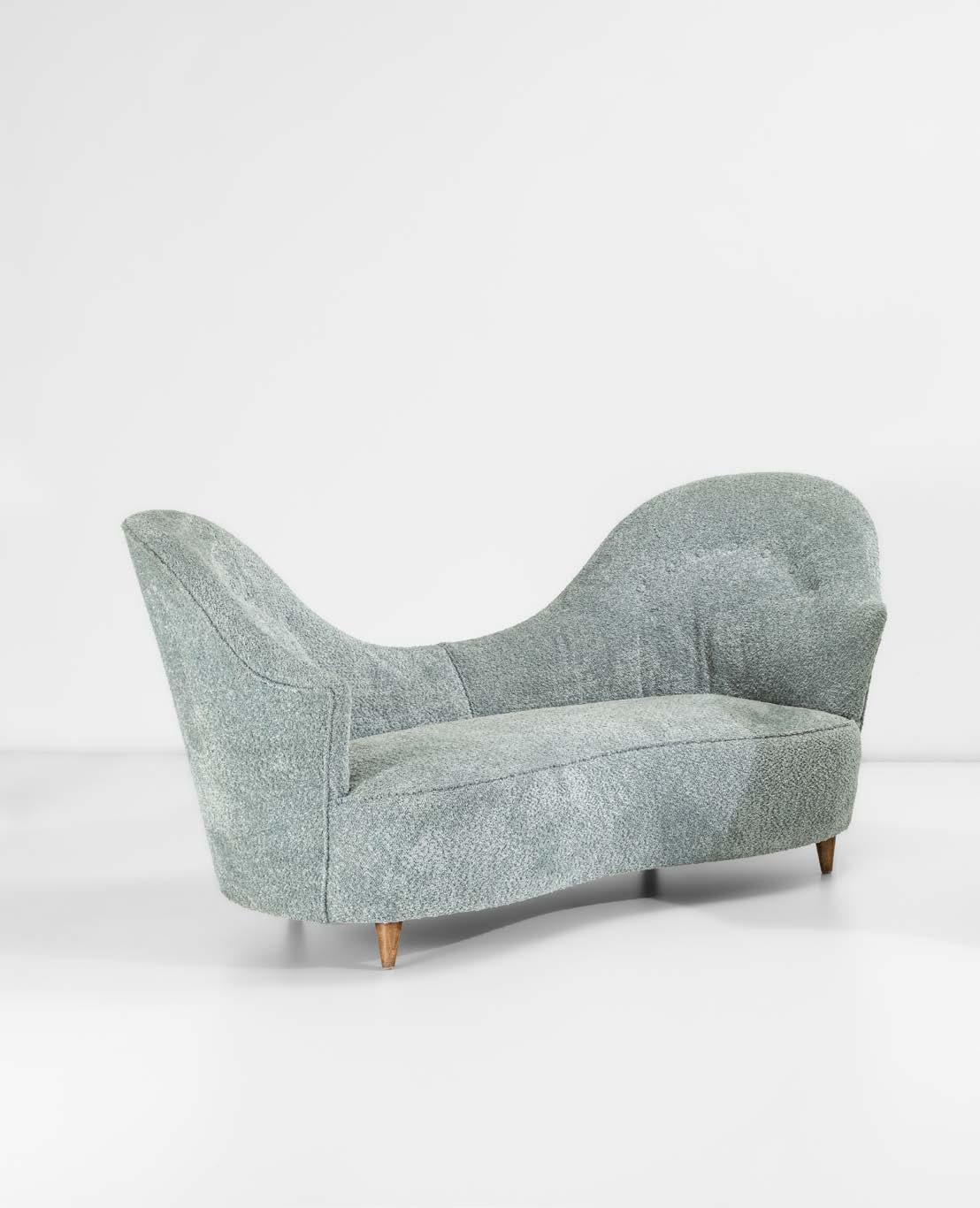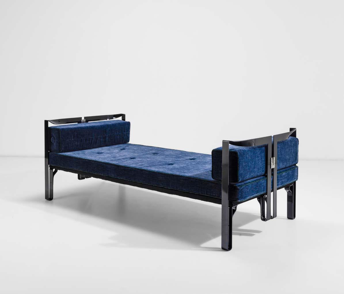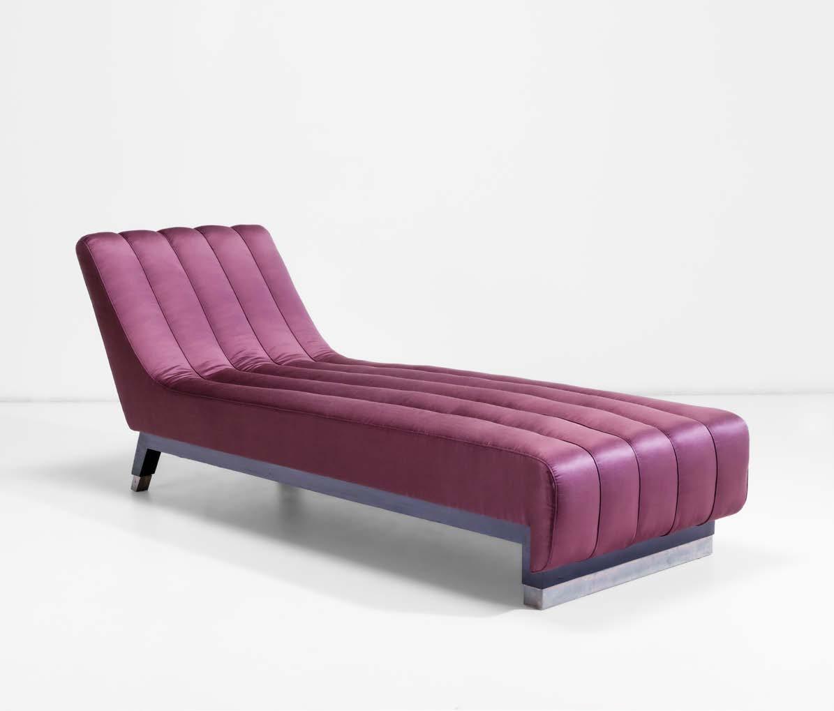 Struttura e sostegni in legno, puntali in metallo nichelato e rivestimento in tessuto. Prod. Italia, 1930 ca. Cm 190x76x75