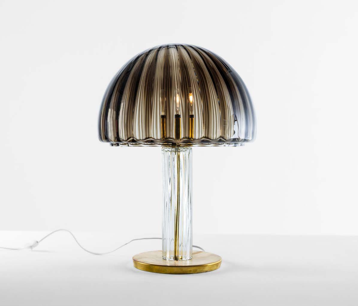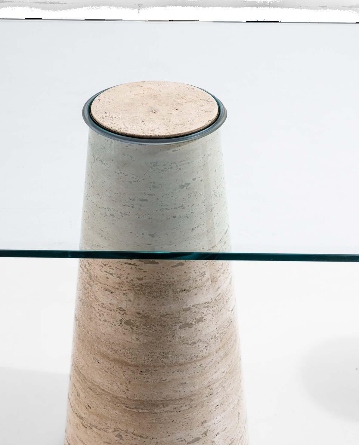 Sostegni con rivestimenti in vetro di Murano a tortiglione. Piano in cristallo molato di forte spessore.