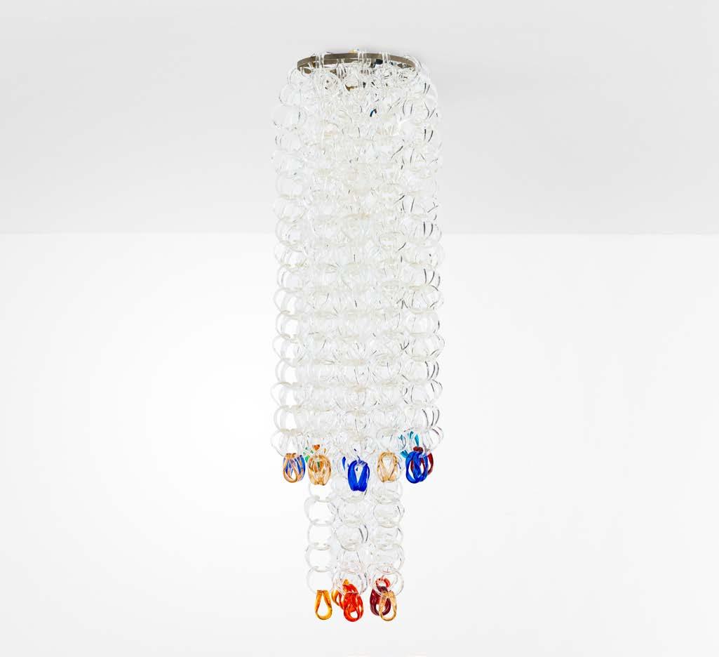 Struttura in metallo e diffusore in vetro di Murano cordonato.