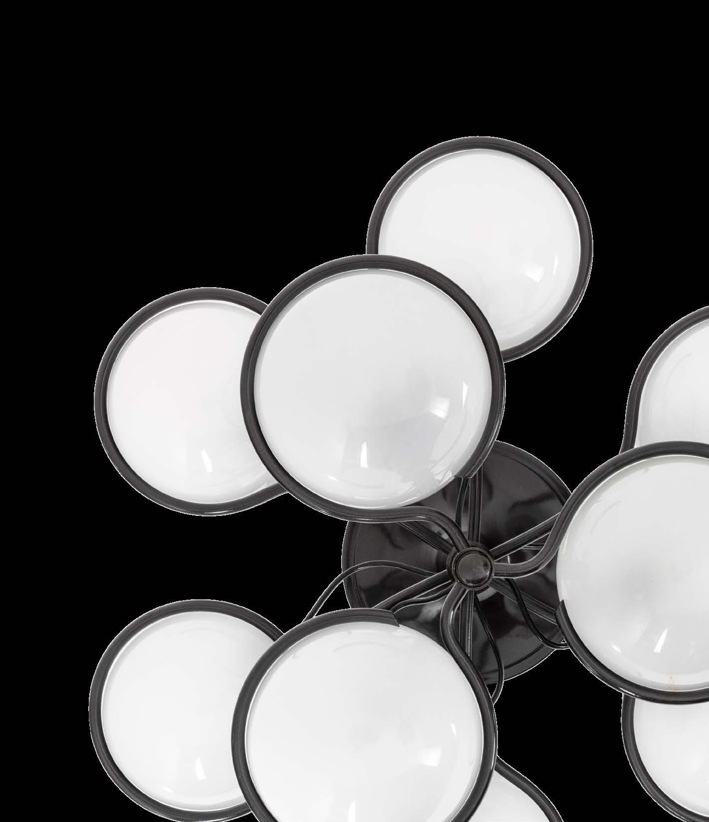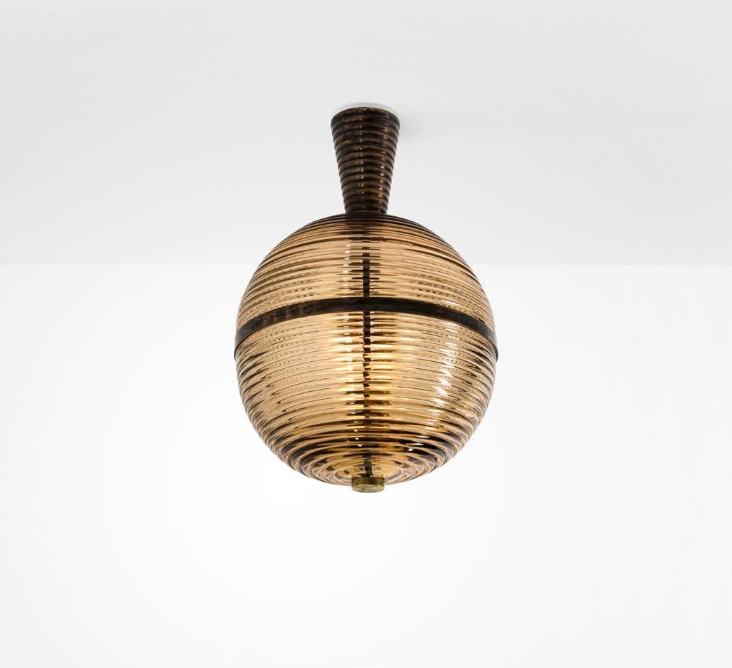 Struttura in ottone e ottone lavorato con diffusori in vetro di Murano cordonato.