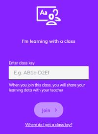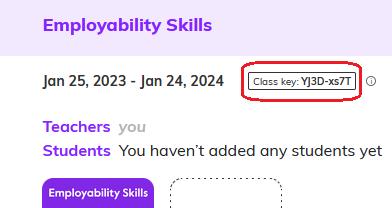 Para que seus alunos participem desta turma, você precisará fornecer a eles uma “class key”. Vá para a guia “My classes”, procure o módulo e você verá a class key. Aqui está um exemplo: