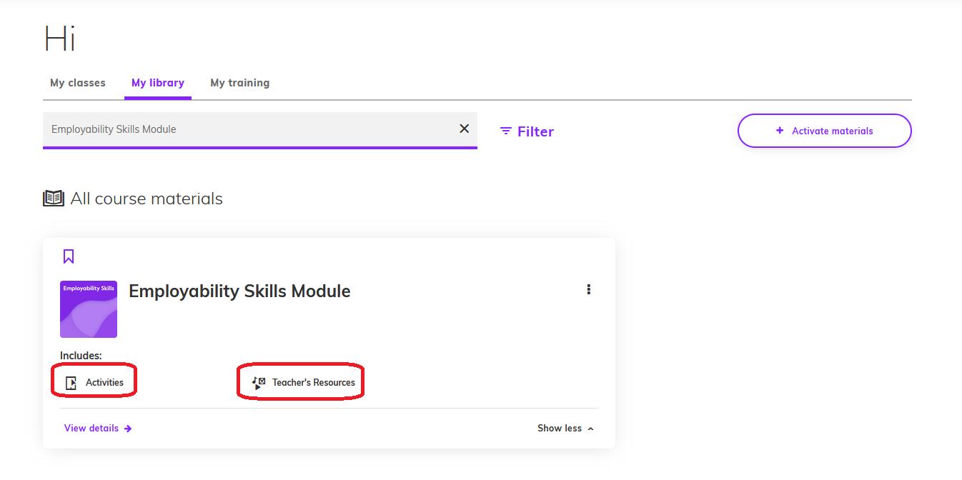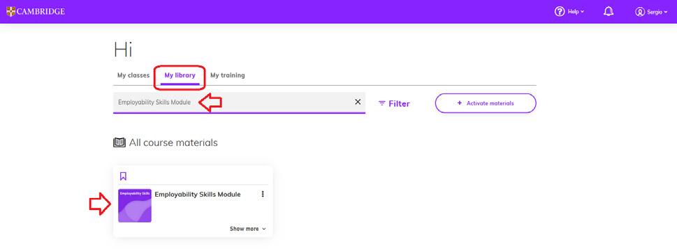 Clique na opção “My library” no menu superior esquerdo e depois, no campo “Search my library”, digite Employability Skills Module e selecione o módulo.