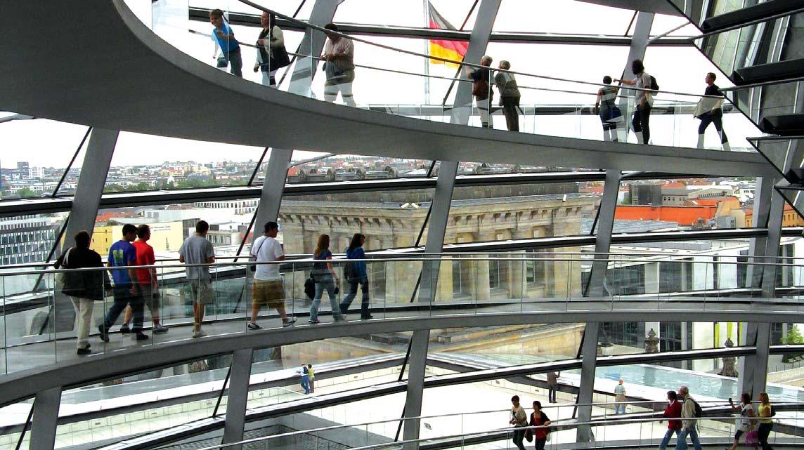 ultra-modern shiny metal railings and glass dome. A ramp that circled the dome led to a platform with an amazing 180-degree view of Berlin. The remodelled building is truly a great work of modern art.