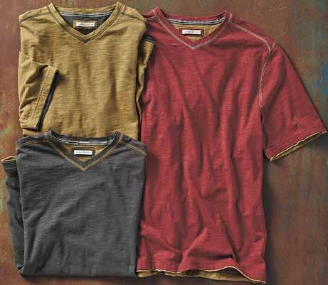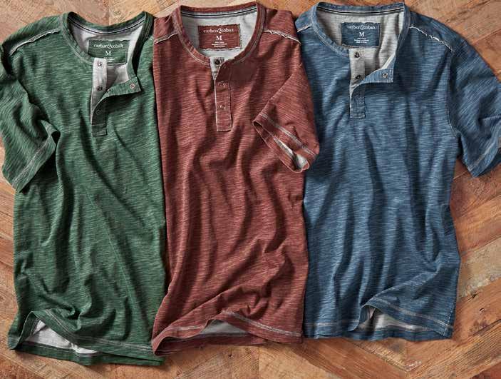 VELOCE HENLEY Level up your knit collection with this cool, printedface slub jersey tee. Soft and substantial, it has a henley-style snap placket, raw edge seam detail at the shoulder, and a contrasting cover stitch throughout. 100% cotton body. Imported in Spruce, Wine or Navy. Men’s sizes: S-XXL. [144540] $79