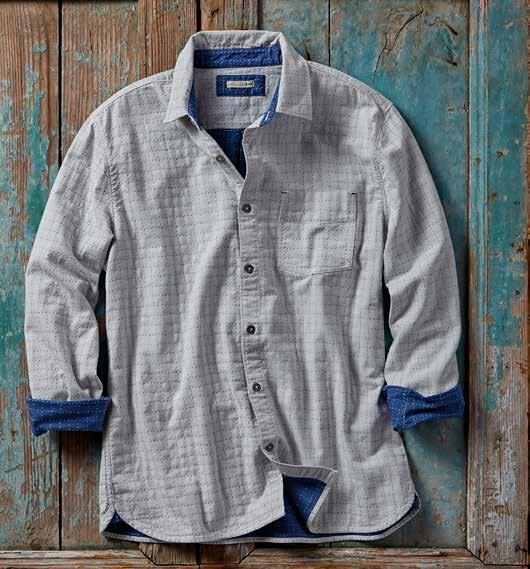 Two of our favorite things - dobby fabric and double cloth - come together in this breezy shirt that’s cool in both senses. Featuring a vertical “dash” thread pattern, the inside is lined with smooth cotton gauze. Chambray trim at the inner collar, cuffs, and outer back yoke locker loop. 100% cotton. Imported in Steel or Terracotta. Men’s sizes: S-XXL. [133897] $89