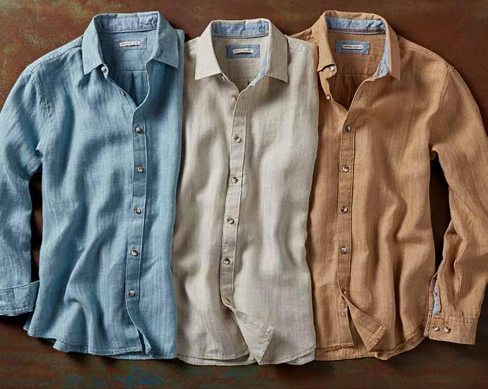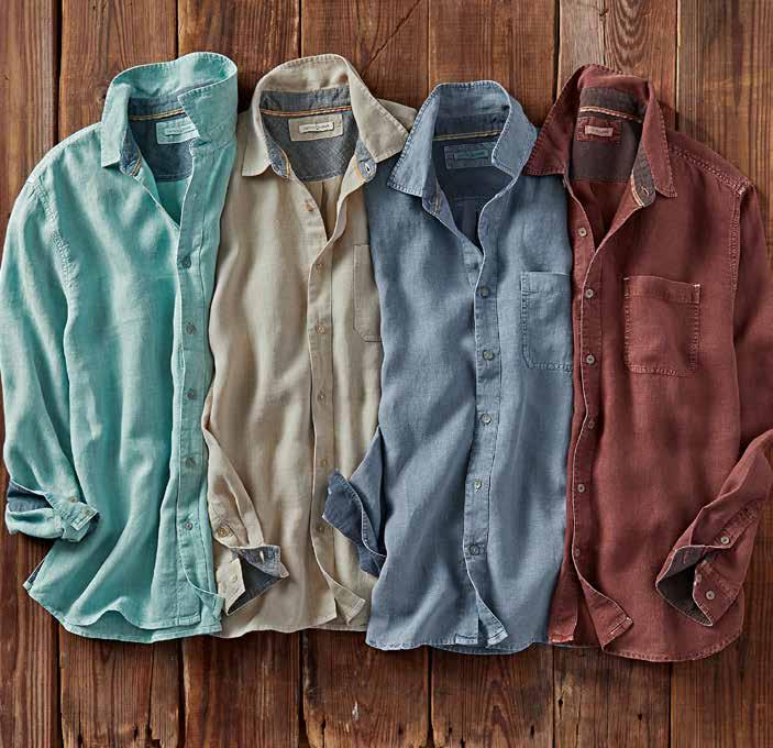 It’s time to summon the linen shirt. Super soft and rich in color thanks to the pigment dye and wash, this is your new solid go-to for the warmer temps. Contrast trim at inner neckline, back yoke and inner cuffs. Side slits. 100% linen shell. Imported in Turquoise, Natural, Chambray or Brick. Men’s sizes: S-XXL. [ 133867 ] $95