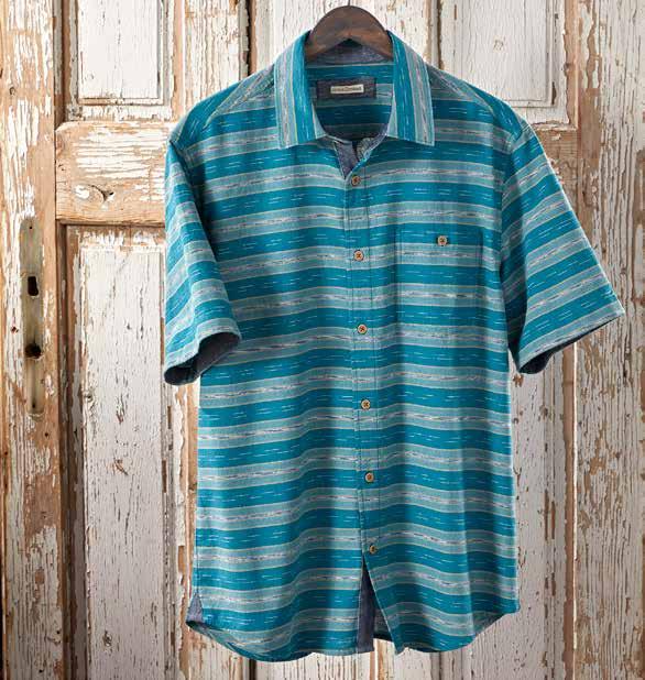 A shirt that gets more and more interesting the closer you look. Featuring a play of richly textured chain stitch over stripes of deep blue and sea green, this is the fun shirt that still manages to play it cool. Soft knit trim at the inner collar adds a soft touch. Interior chambray trim plus locker loop at the back. 100% cotton. Imported in Multi. Men’s sizes: S-XXL. 133861 ] $89