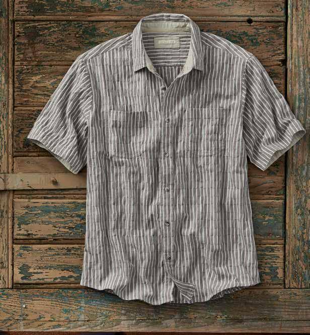 We love the sense of motion in this dobby stripe. And while the look is unique, the gray ground gives it a sophisticated versatility. A cool-wearing pick, this short sleeve easily transitions from the end of the week into the weekend. Interior contrast poplin trim. Antiqued metal buttons. 100% cotton. Imported in Multi. Men’s sizes: S-XXL. [ 133891 ] $89