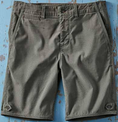 flat front shorts We’ve taken a supremely durable and textural all cotton Bedford fabric and washed it to suppleness for a short with detail. High on endurance and style, to separate it from the pack, it’s crafted with heavy stitching and seams reinforced with rivets found on early denim garments. Chambray chain stitch inside the waistband. Imported in Stone, Burnt Henna or Cerulean Blue. Men’s Sizes 30-40 (even) also 33 and 35. 12" inseam. [ 122002 ] $99
