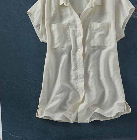 The essential white shirt for warmer weather. Crisp and lightweight, with a lovely structure that drapes away from the body, it features flattering dolman cap sleeves and a vintagecool, tonal floral jacquard pattern. Two drop-in chest pockets and side slits. 74% cotton, 26% nylon. Imported in Ecru. Women’s sizes: XS-XL. [ 333171