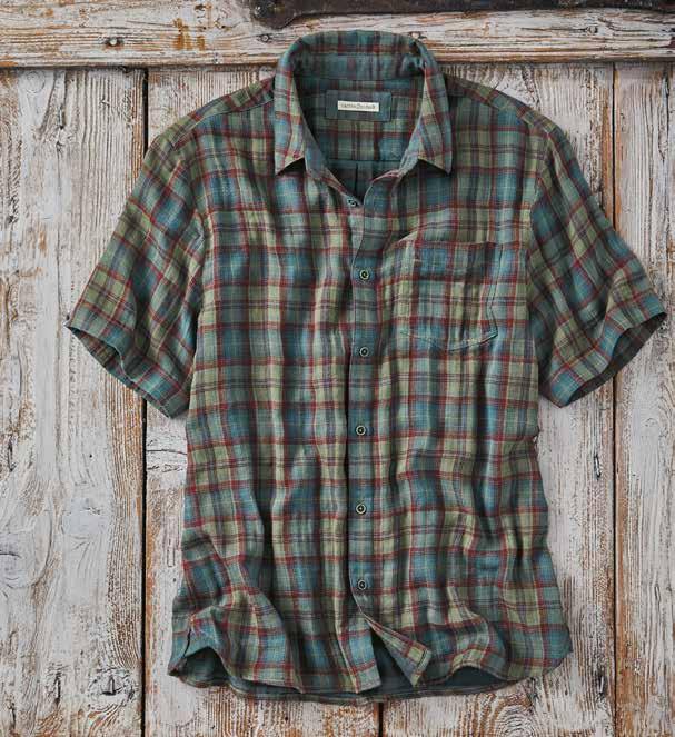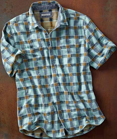 wildflower plaid Try not to smile when you see - and feel - this short-sleeve double cloth. This shirt is a celebration of warm seasonal colors. Breezy and lightweight, the interior aqua fabric peeks from the collar for more mood-boosting. Reverse fabric trim at the side vents and outer back yoke locker loop. 100% cotton. Imported in Multi. Men’s sizes: S-XXL. [ 133880 ] $89
