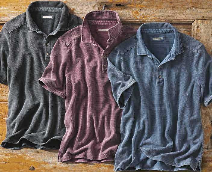 We love this polo’s unique texture (like an exaggerated pique). It also has a soft, surprisingly lightweight feel. Washed down for a sun-fade finish, it has a dropped shoulder seam with fine woven trim for interest. Fine woven twill at inner collar and inner placket trim. Side vents. 100% cotton. Imported in Carbon, Merlot or Ice Blue. [ 144561 ] MEN’S S-XXXL AND MT-XXXLT SIZES $85