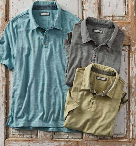 The polo goes for a seaside drive with the top down. Made of pigmentdyed slub jersey, it’s perfectly sun-washed in looks and soft in feel. Woven chambray trim at the collar and placket gives it even more character.