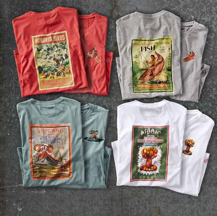 firework tees Light up your t-shirt rotation with these vibrant, vintage graphic tees. Made of soft cotton jersey, a large design is featured at the back, with a small one on the chest. Water-based screen print. Crew neck. 100% cotton except Gray (80% cotton, 20% poly). Imported. Choose from Red (Birds), Gray (Fish), Blue (Volcano), or White (Atomic). Men’s sizes: S-XXL. [ 144620 ] $49