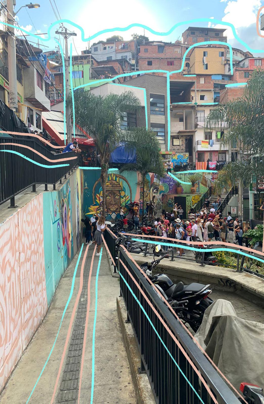 Fig 13: Escaleras eléctricasEl Graffitour es el recorrido y galería urbana al aire libre ubicada en el Barrio Las Independencias I de la Comuna 13: San Javier, es un recorrido por medio de graffitis y murales, donde se cuenta la historia de violencia de la comuna, donde el arte se convirtió en una manera de cambiar la realidad de los habitantes del sector.