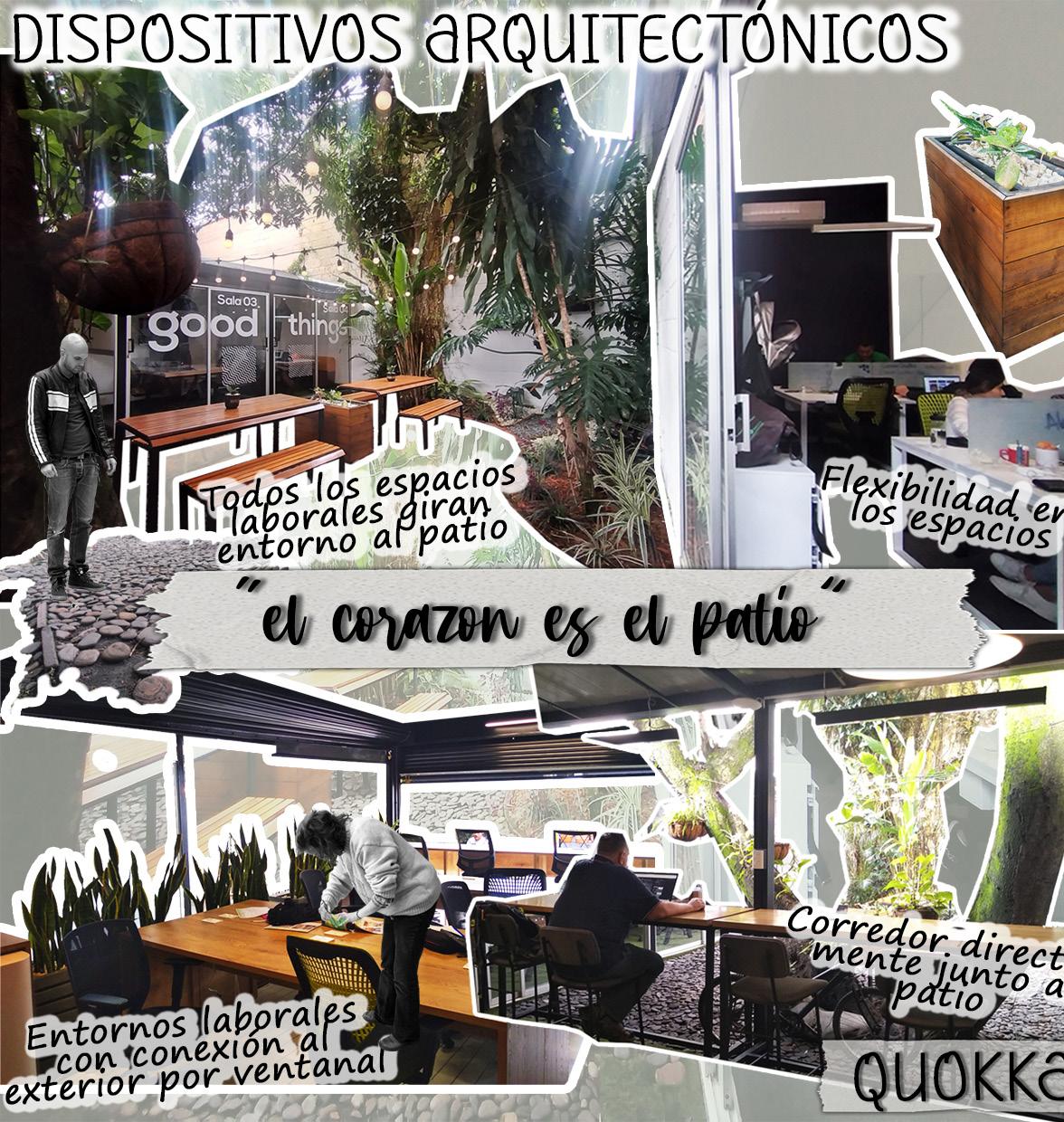 este caso, los coworking. Quokka Coworking, hace alusión a estas estrategias arquitectónicas (en este caso un patio) y las estrategias paisajísticas (utilización de vegetación).