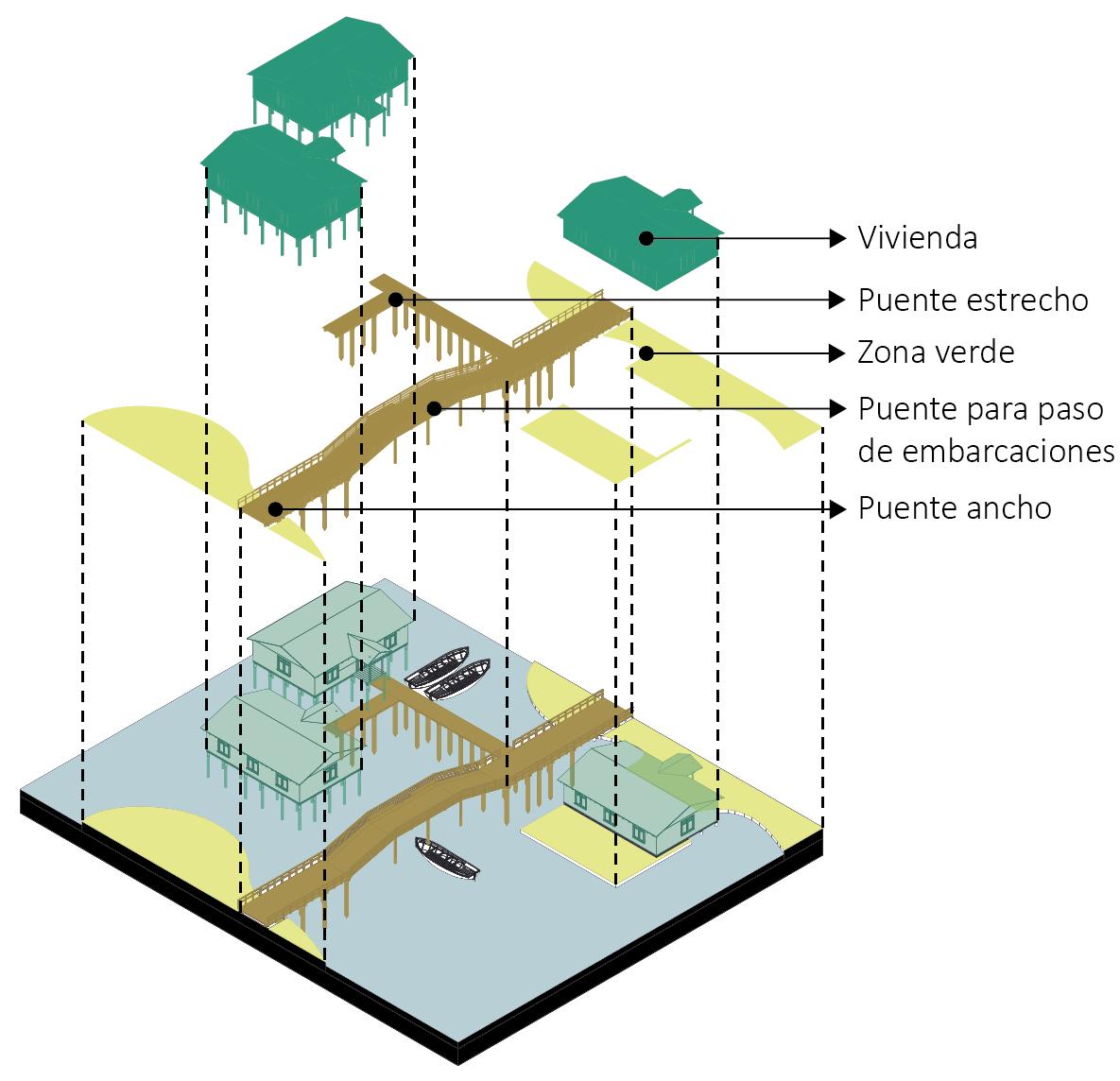 • Figura 108 Isométrico de puentes. Lineamiento A. Estrategia 3. Elaboración propia.