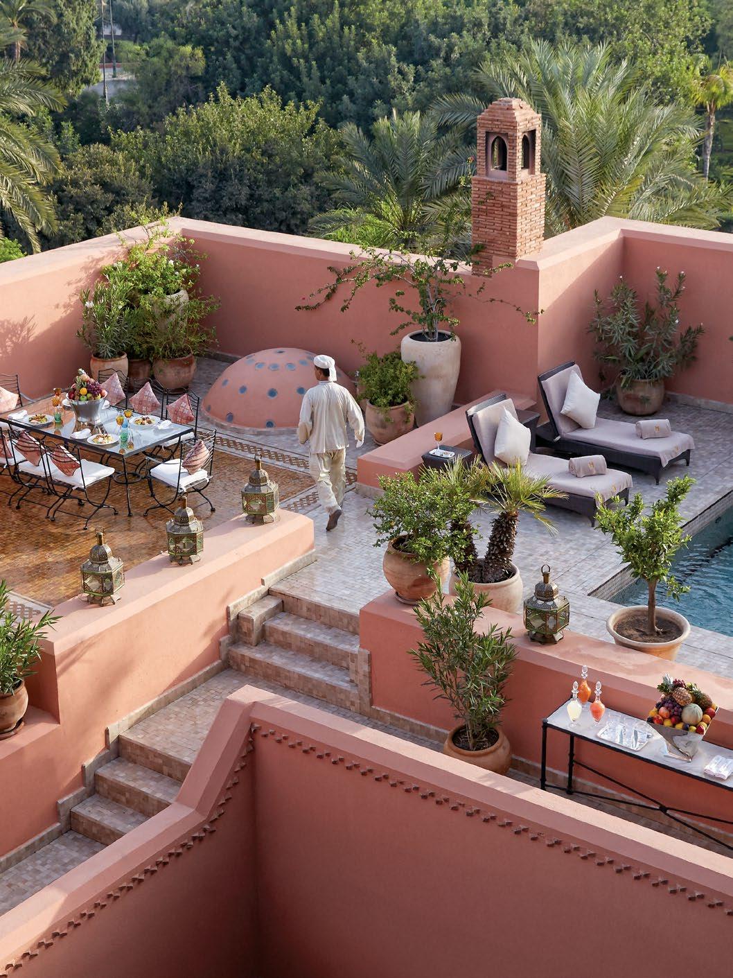 Step inside the gates of ROYAL MANSOUR and the hubbub of Marrakesh slips away, replaced by a world of unparalleled elegance. Commissioned by its owner, King Mohammed VI, this 12-acre hideaway, opened in 2010 within the walls of the Medina district, is a true celebration of Moroccan craftsmanship. Every detail has been meticulously created by 1,200 artisans, from its carved ceilings to the intricate tiling. A premium is placed on privacy and discreet service at this regal refuge, as evidenced by a network of hidden tunnels accessed by butlers who cater to guests’ every whim, and a staff-toguest ratio of 10 to 1.