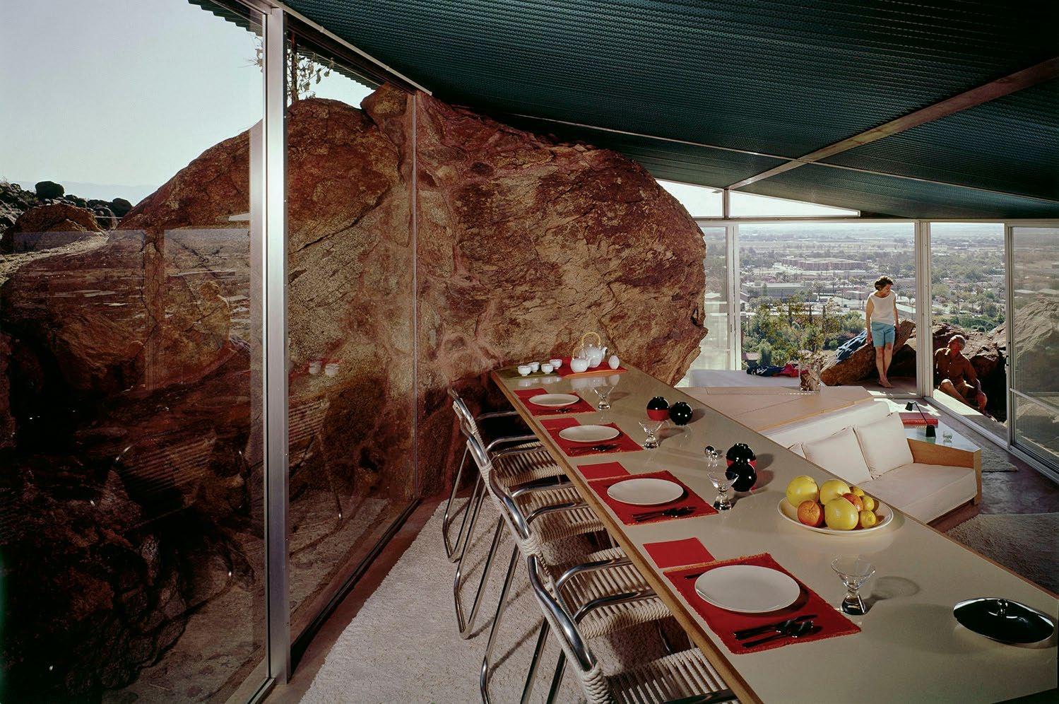 The balance between nature, technology, and recreation’s presence varies from architect to architect. At the Kaufmann House, the silver and gray metal structure is almost purely technological — a steel- and-glass tent purposely set against the irregular backdrop of the mountain. On the other end of the scale, the organic shapes of surrounding rock formations almost entirely define the structure of the Doolittle House. Between these ends of the spectrum the dramatic cantilever roof of E. Stewart Williams’s Edris House is carefully balanced by the prominent rock-clad chimney that anchors it in the ground. •