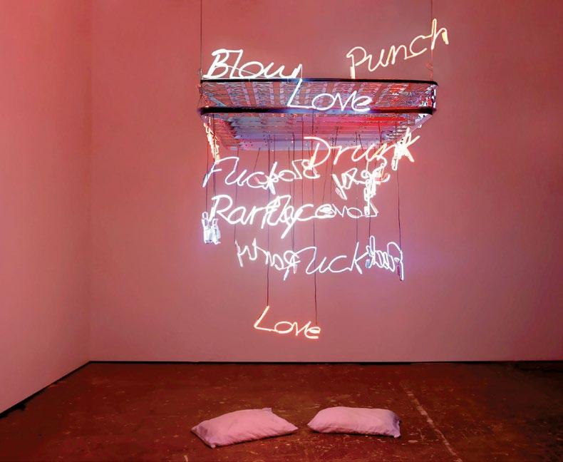 Gallery, was opening an L.A. outpost. “I always loved David Hockney and watched films about his journey from London to L.A. that really inspired me,” he says. “It meant a whole new market and the freedom to work with different mediums.” After landing in West Hollywood, he began to combine neon with his found objects, but it wasn’t until the pandemic that a proverbial light bulb went on. “I’d walk past all these shuttered restaurants and bars and see chairs stacked on top of each other,” Hopgood says. “I wanted to make something in that difficult moment and, I suppose, use it as my therapy.” Seeing towers of chairs also dredged up memories of being bullied as a young schoolboy that brought deeper context to his work. “I remember hiding underneath the stacked-up chairs in the school canteen — that was my place of sanctuary.” It was a full-circle moment for Hopgood that brought purpose to his art. “I’m making work with a story behind it that a lot of people can relate to.”