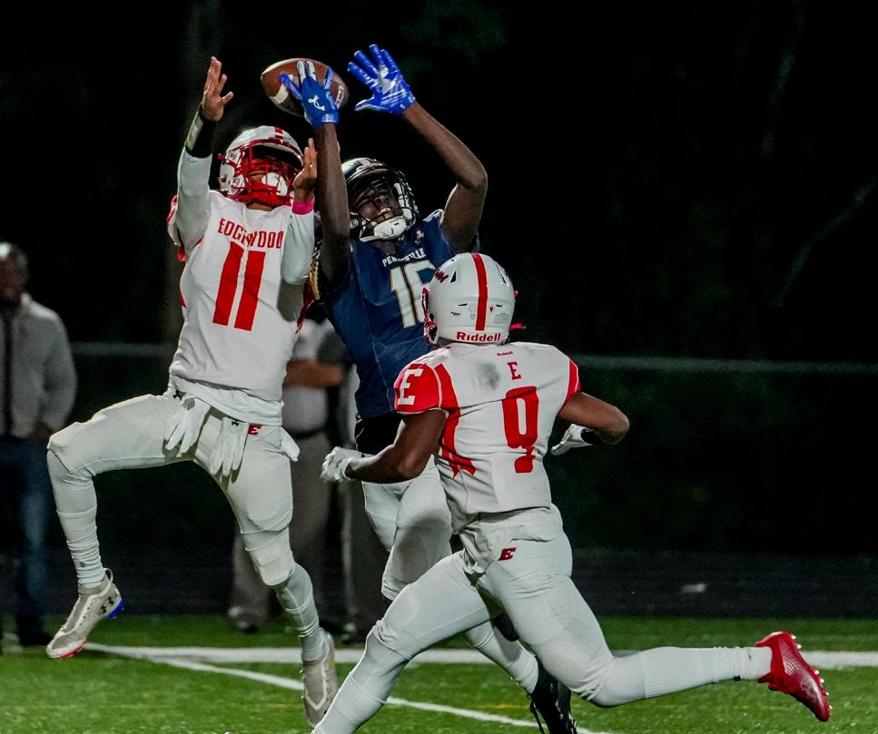 Having struggled for most of the game, Edgewood’s offense finally began to click when junior quarterback Caesar Travers connected with an open Michael Lee for a 26-yard score with 8:56 left to play, giving the Rams a 13-3 advantage after Perryville senior Sydney Phillips blocked the extra point.
