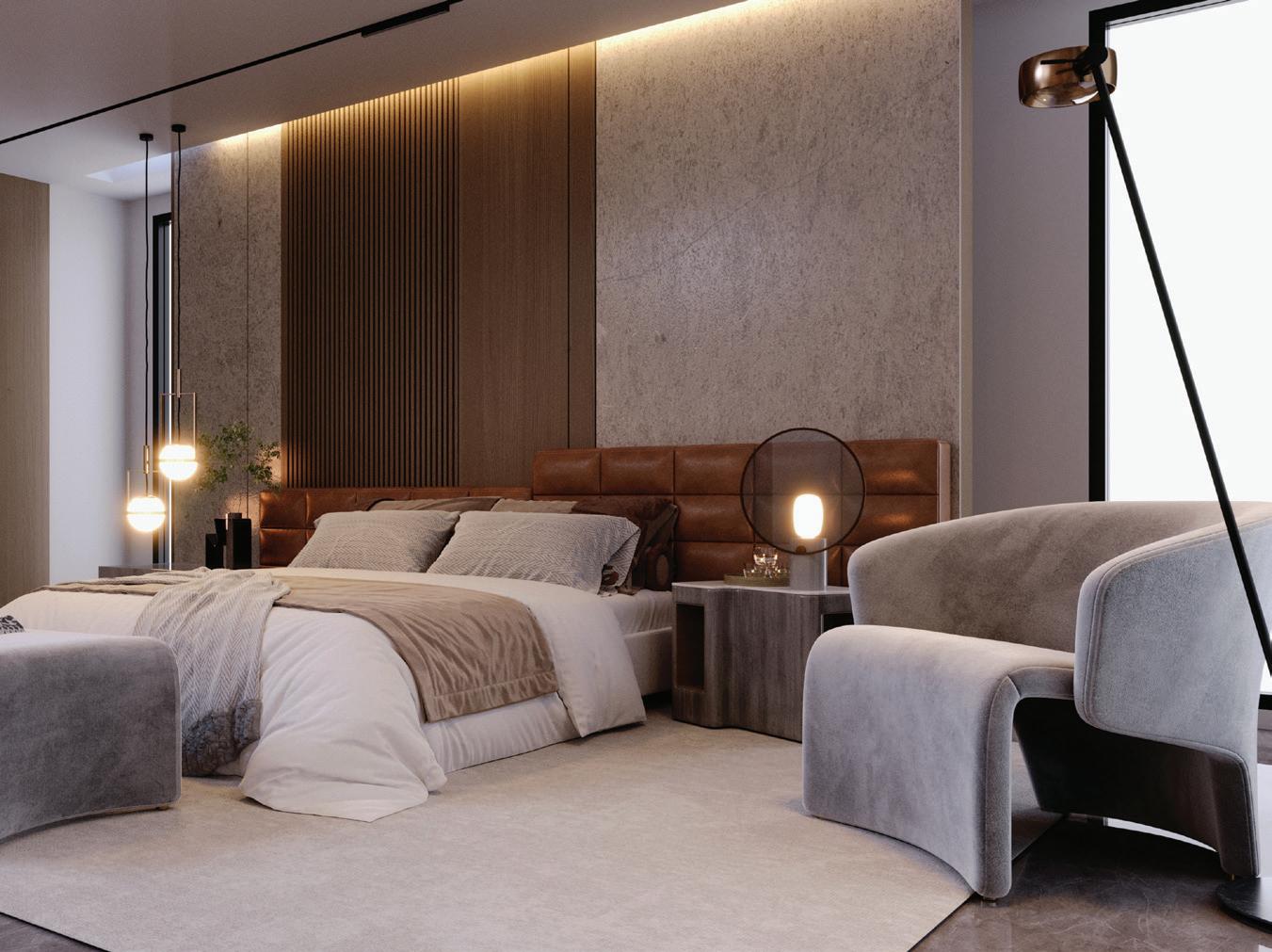 A suite of harmonious lighting fi xtures, from a warm, glowing chandelier to translucent-skinned sconces, can create a custom mood and look. Some homeowners may prefer to combine headboard-mounted adjustable lamps that enable spot-lit reading in bed with soft, ambient perimeter strip lighting that gently illuminates the walls of the room without breaking the spell of sleep. Others may prefer automatically dimming arrays that mimic fi rst light or the subtle colors of twilight. Whatever scheme is most desirable, the materials of the lighting fi xtures should work in concert with the colors