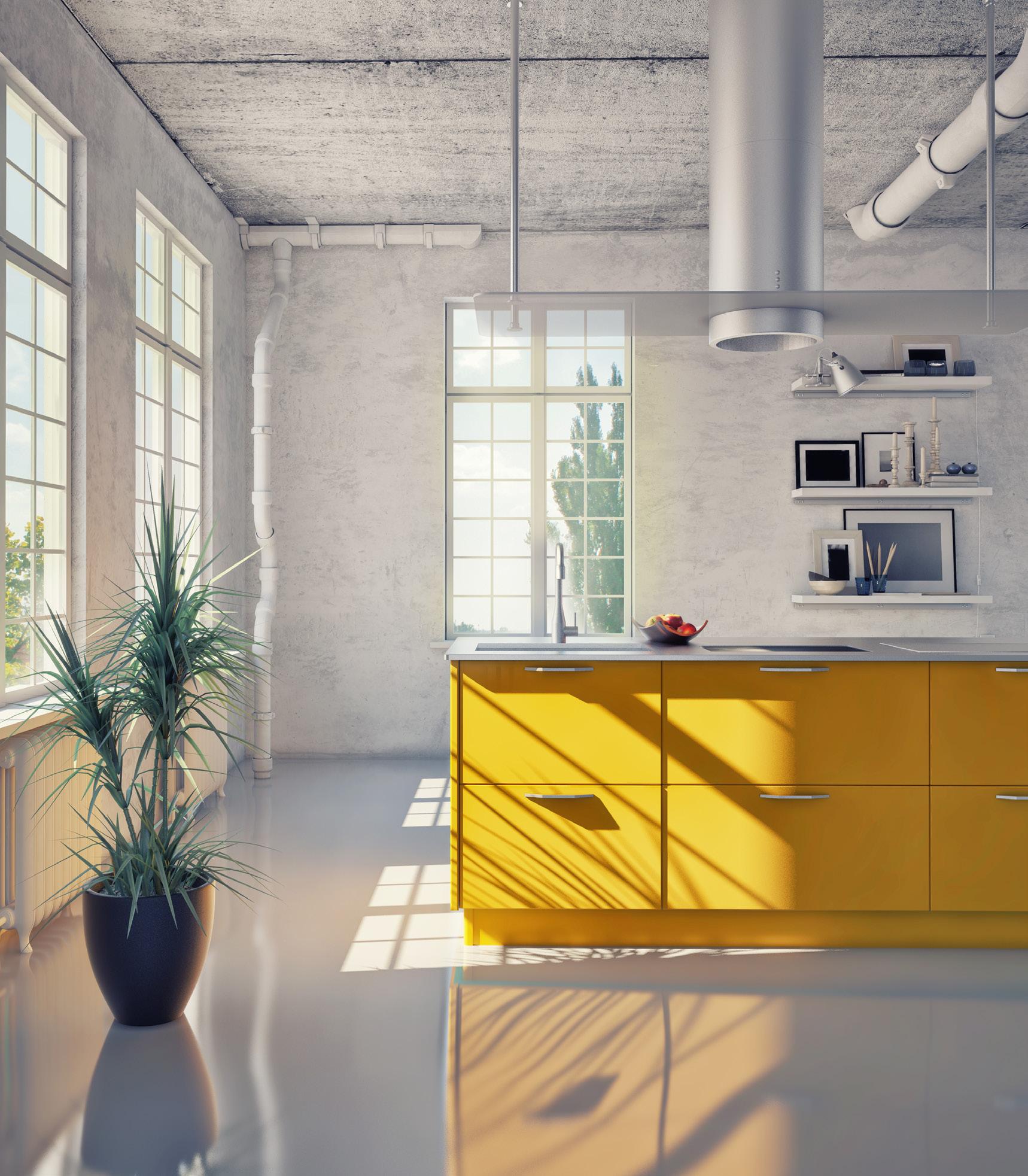 A monochrome room is a great background for a splash of bright color. Yellow is a lively, fun choice for your kitchen.