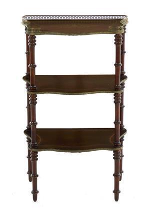 Edwardian Inlaid Mahogany Three-Tier Table circa1900,brassgallery,scrolling floralinlaidtop;H311/2"W19"D12"