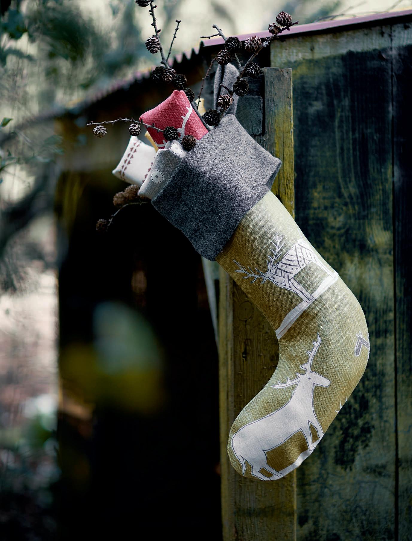 Remnants of fabric left over from home furnishing projects throughout the year can easily be transformed in to Christmas stockings. Plains, tweeds and tartans will work particularly well. Alternatively invest in a metre or two of fabrics showcasing flora and fauna associated with the festive season. Different sizes can be used for different purposes – tiny versions with a small ribbon loop attached can be used to hang on the tree as decorations, or embroidered with guest’s names and used as place settings, perhaps with a tiny chocolate or two tucked inside. Larger ones can be made to hang on the end of a bed, or to adorn a mantelpiece, and given to family members, filled with gifts and kept as mementoes for many years to come. Draw a boot/stocking shape on a piece of paper or look online for a free downloadable template and use as the pattern to cut out a back and front in co-ordinating fabrics. A fabric lining is optional but would add an extra finishing touch, as will a turnover at the top in a matching pattern or plain colour. n